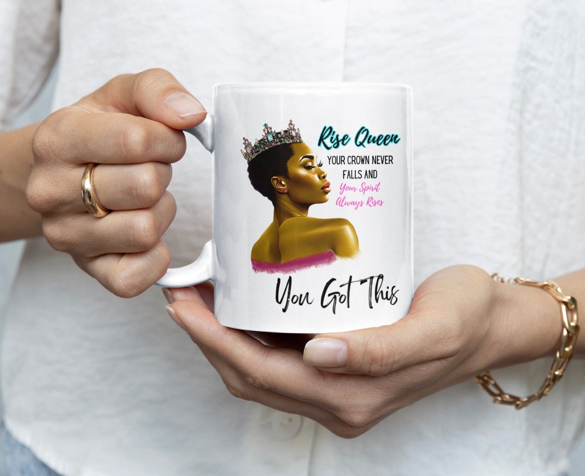 Rise Queen and begin your day with a calming beverage using this affirmation ceramic coffee mug, which is microwave and dishwasher-safe, free from BPA and Lead, and crafted from durable white ceramic.
