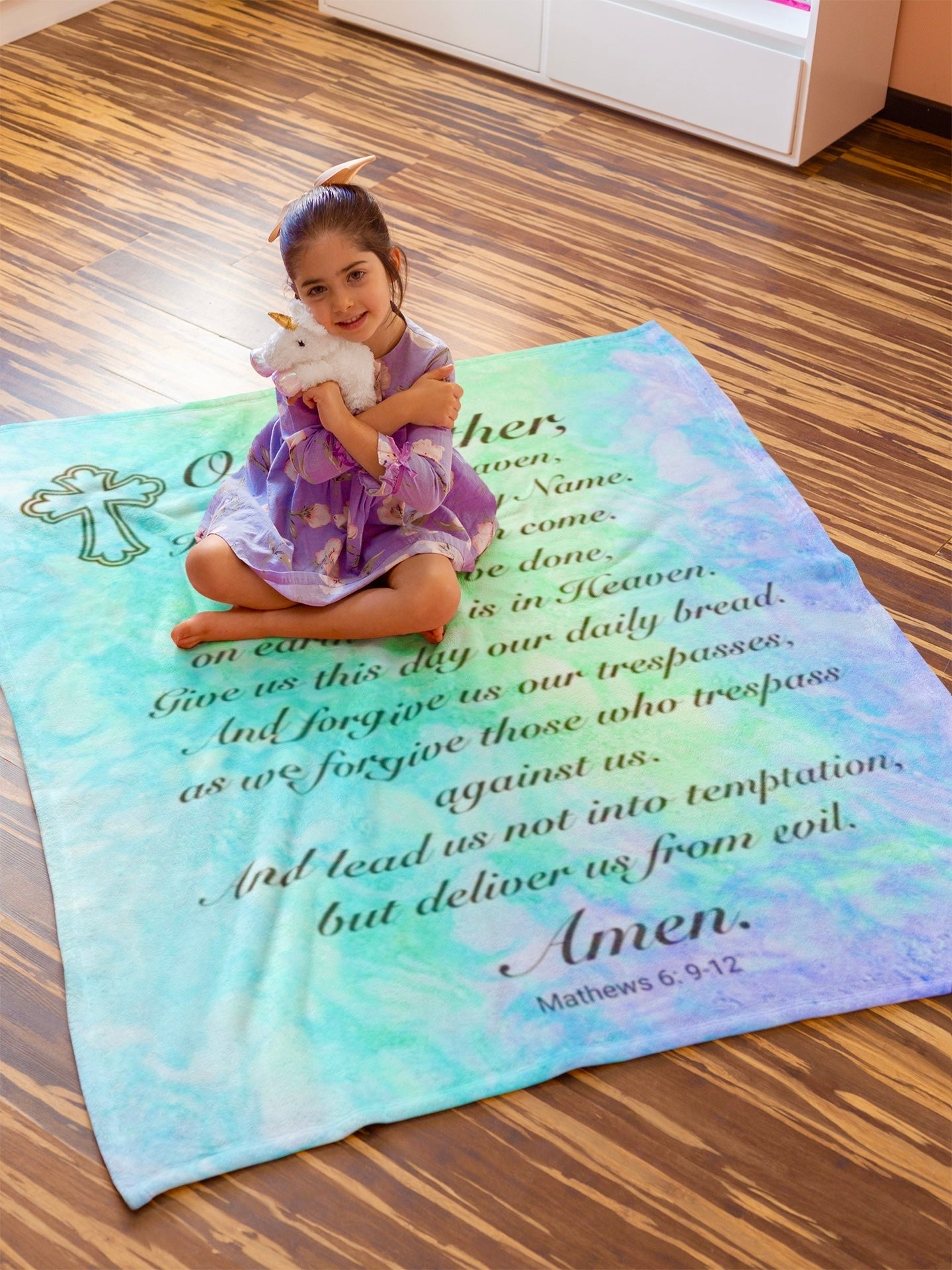 Everyone has their beloved blankie, and if not, this one fits the bill perfectly. Available in various sizes to accommodate children and adults The 2” stitch ensures durability, maintaining the blanket’s edges. Crafted from luxurious fleece with a beautiful prayer.
