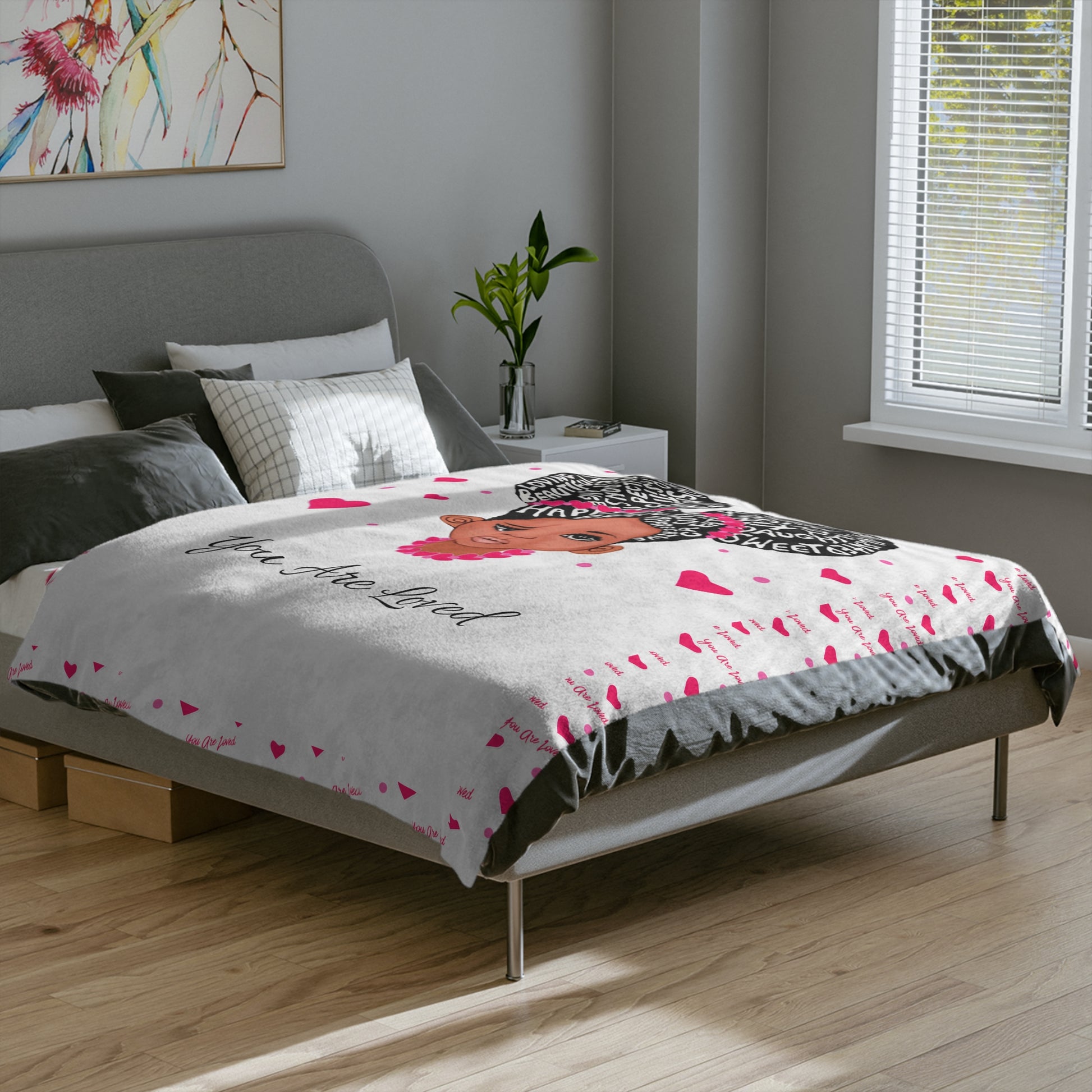 You are Loved milnky blanket from the positive vibe collection for girls. The 2" stitch makes sure the blanket's borders stay intact. It's made from a super-soft fleece that'll be decorated with your eye-catching designs in picture-perfect quality.